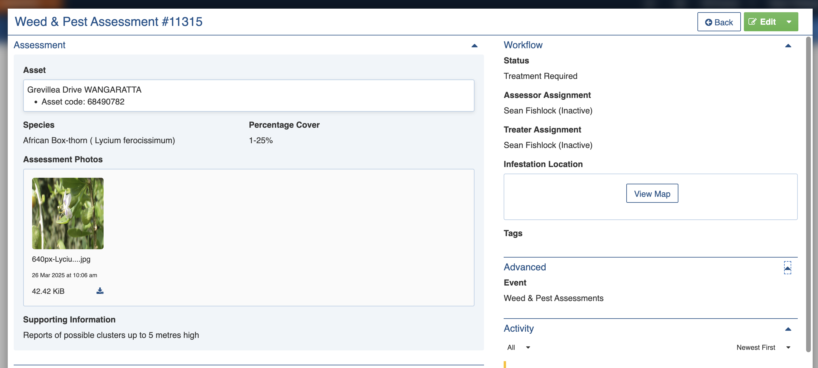 <figure><img src="https://3923904090-files.gitbook.io/~/files/v0/b/gitbook-x-prod.appspot.com/o/spaces%2FNy7IznbrPLUq6GJDDQDk%2Fuploads%2FuSTLHqJJFdRVbRYU8ebs%2Fimage.png?alt=media&#x26;token=54283d8b-aeab-4228-88ef-191964ba962b" alt=""><figcaption><p>Editing a Weed &#x26; Pest Assessment for treatment of Sweet Pittosporum</p></figcaption></figure>