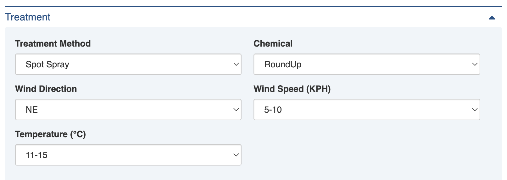 <figure><img src="https://3923904090-files.gitbook.io/~/files/v0/b/gitbook-x-prod.appspot.com/o/spaces%2FNy7IznbrPLUq6GJDDQDk%2Fuploads%2FN3MjfAfM4fwWmW5sLrDE%2Fimage.png?alt=media&#x26;token=1481d845-0313-41f8-ab20-1ebfe6d6c1c0" alt="" width="375"><figcaption><p>Treatment details for spraying with weather conditions</p></figcaption></figure>