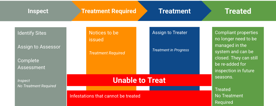 Assessments are managed by workflow which starts with an initial inspection to identify sites and is followed by assessment and treatment if required. A summary of this process is shown below.