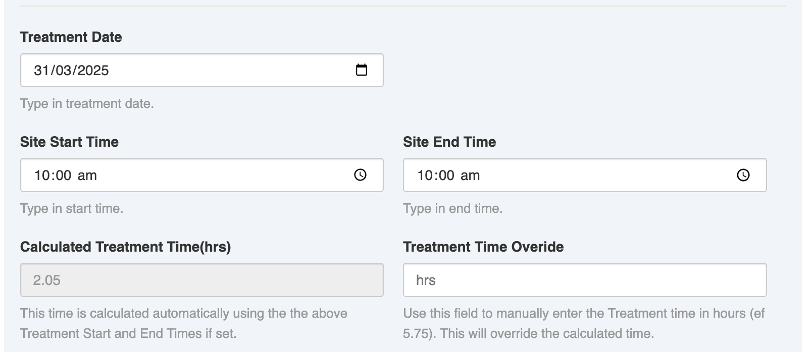 Several fields are used to record the Treatment time the duration of onsite treatment work for which is also automatically calculated based on what is entered.