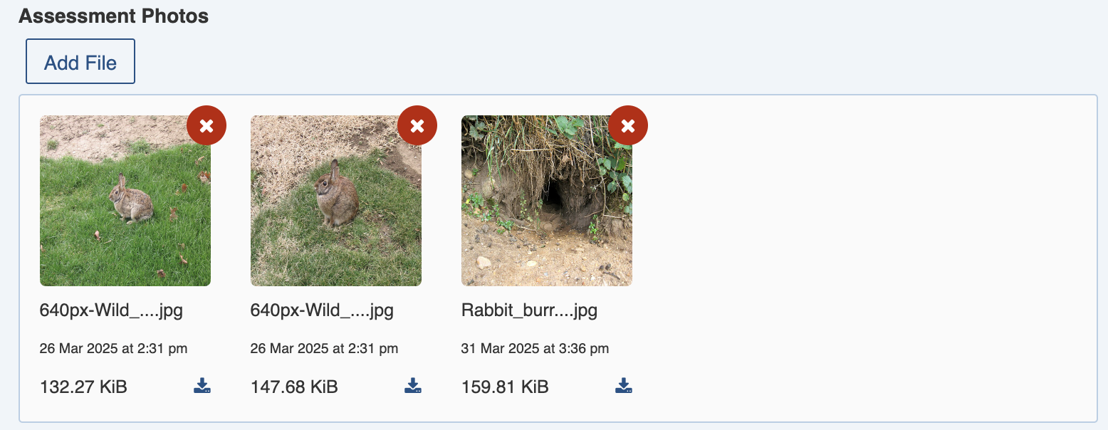 <figure><img src="https://3923904090-files.gitbook.io/~/files/v0/b/gitbook-x-prod.appspot.com/o/spaces%2FNy7IznbrPLUq6GJDDQDk%2Fuploads%2Fq37DZUdSw4k3ypkOBu7N%2Fimage.png?alt=media&#x26;token=909a0169-5672-47fe-9fab-b23566c6adbf" alt="" width="375"><figcaption><p>Photos recording a suspected rabbit infestation</p></figcaption></figure>