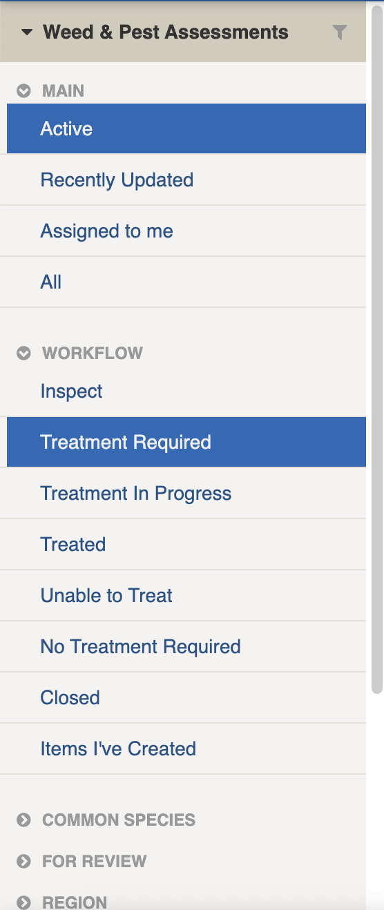 <table><thead><tr><th width="247">Filter Group</th><th>Filter/s</th><th>Use</th></tr></thead><tbody><tr><td>Main</td><td><p>Active</p><p>Recently Updated</p><p>All</p></td><td></td></tr><tr><td></td><td>Assigned to Me</td><td>Assigned to me will show you any assessments that you've been assigned to as an Assessor or Treator</td></tr><tr><td>Workflow</td><td>Inspect</td><td>Shows all items that have been inspected</td></tr><tr><td></td><td>Treatment Required</td><td>Shows all items that require treatment</td></tr><tr><td></td><td>Treatment in Progress</td><td>Shows all items that are currently being treated</td></tr><tr><td></td><td>Treated</td><td>Shows all items which have had treatment applied</td></tr><tr><td></td><td>Unable to Treat</td><td>Shows all items which have been deemed not able to be treated</td></tr><tr><td></td><td>No Treatment Required</td><td>Shows all items that did not require treatment</td></tr><tr><td></td><td>Closed</td><td>Shows all items that were closed</td></tr><tr><td>Common Species</td><td><p>Blackberry</p><p>Sweet Pittosporum</p><p>Pampas Grass</p><p>Ragwort<br>*</p></td><td>Pre-configured list of commonly reported species. Shows all items for this species</td></tr><tr><td>For Review</td><td>Has Supporting Information <br>Has Treatment Comment<br>Treatment Time Required</td><td></td></tr><tr><td>Region</td><td>[List is based on your system configuration]*</td><td>Shows all items for a specific <a href="../../../concepts-and-fundamentals/concepts-and-fundamentals#sites-and-regions">Region</a>.</td></tr><tr><td>Species</td><td>[List is from your species database]*</td><td>Shows all items for the selected species</td></tr><tr><td>Percentage Cover</td><td></td><td>Shows all items that fall within the percentage cover range</td></tr><tr><td>Treatment Method</td><td><p>Cut and Paint</p><p>Hand Pull</p><p>Spot Spray<br>*</p></td><td>Shows all items matching the treatment method</td></tr><tr><td>Active tags</td><td></td><td><p>Any tags in use.</p><p>Refer to: <a href="../../concepts-and-fundamentals/on-a-computer/using-the-datagrid/tagging-items">tags</a></p></td></tr></tbody></table>