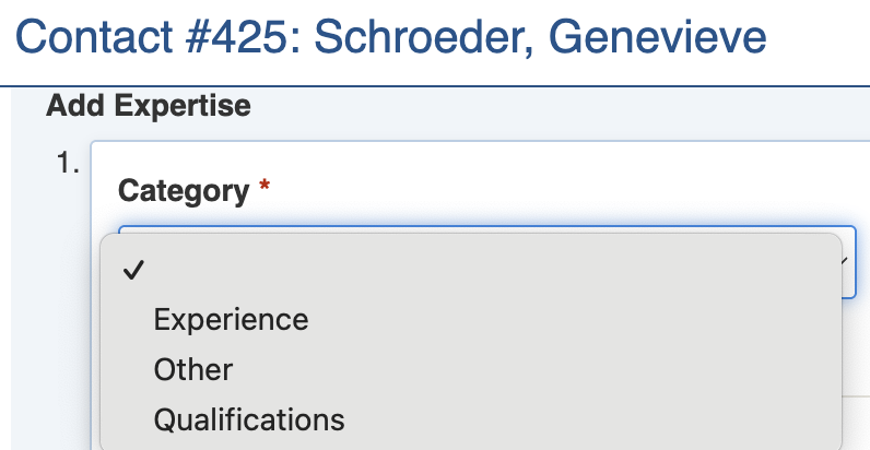 This field is used to categorise the experience of the person. These are master categories, for example Experience, Qualifications, Licenses & Checks etc. You can select one using the pulldown list provided. Your Administrator can configure the list for your site using the *Expertise Category* [lookup](https://docs.cw.crisisworks.com/system-administration/configuring-the-system/lookups).