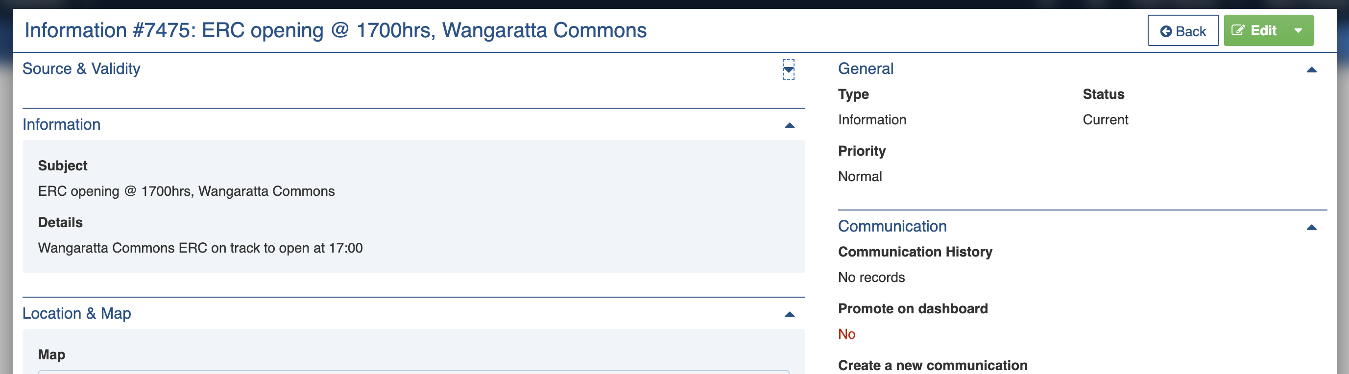 The Location & Map records an optional geographical location that the *Information* pertains to. This is displayed on the Register's map view.  Use the Asset field and location selector to set the location.