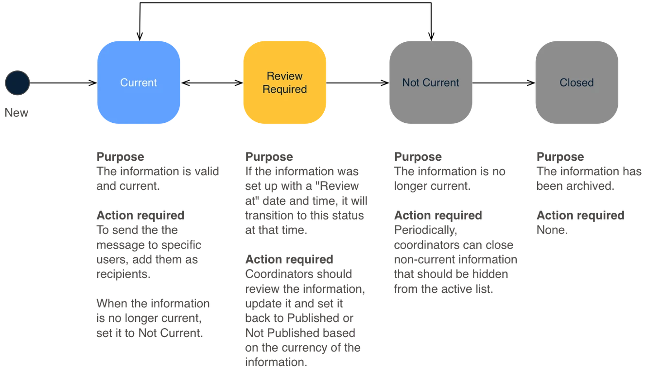 <table><thead><tr><th width="130">Status</th><th width="143">Datagrid Icon</th><th>Next available steps</th><th>Notes</th></tr></thead><tbody><tr><td>Current</td><td> <img src="https://3923904090-files.gitbook.io/~/files/v0/b/gitbook-x-prod.appspot.com/o/spaces%2FNy7IznbrPLUq6GJDDQDk%2Fuploads%2FQuwrxUmSn4kWT6PKsEWb%2Fimage.png?alt=media&#x26;token=7c2e79c3-1e46-423c-937a-60bbd8987ba3" alt="" data-size="line"></td><td>Review Required, Not Current</td><td>All new Information begins with this status</td></tr><tr><td>Review Required</td><td> <img src="https://3923904090-files.gitbook.io/~/files/v0/b/gitbook-x-prod.appspot.com/o/spaces%2FNy7IznbrPLUq6GJDDQDk%2Fuploads%2FDGHOV4TBaKodbvQ6AEsr%2Fimage.png?alt=media&#x26;token=9fca6024-dc19-4250-9a2e-412805b442c2" alt="" data-size="line"></td><td>Current, Not Current</td><td>The item needs a review</td></tr><tr><td>Not Current</td><td> <img src="https://3923904090-files.gitbook.io/~/files/v0/b/gitbook-x-prod.appspot.com/o/spaces%2FNy7IznbrPLUq6GJDDQDk%2Fuploads%2FW9x08ZwCnN4MsdAtMIxV%2Fimage.png?alt=media&#x26;token=599beef5-4f6f-47d1-877d-40da65953a7c" alt="" data-size="line"></td><td>Closed, Current</td><td>This information is no longer current</td></tr><tr><td>Closed</td><td> <img src="https://3923904090-files.gitbook.io/~/files/v0/b/gitbook-x-prod.appspot.com/o/spaces%2FNy7IznbrPLUq6GJDDQDk%2Fuploads%2FswDi8AbgP3s4SMlwHxJ2%2Fimage.png?alt=media&#x26;token=e4c4ebad-f43f-47c8-9436-f5e37281b9cc" alt="" data-size="line"></td><td>Reopen</td><td>The information is no longer needed</td></tr></tbody></table>