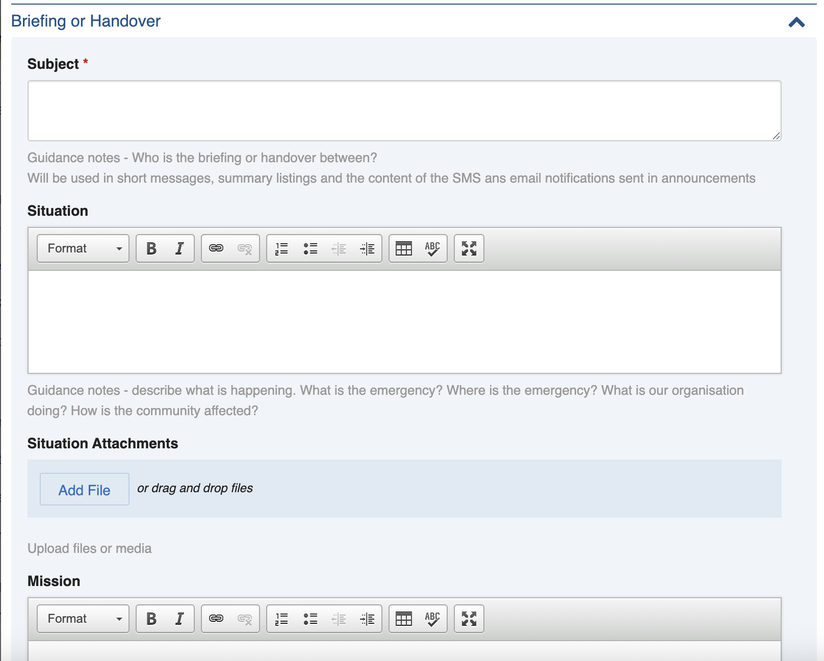 * **Situation -** what is happening and what our organisation is doing. Files can be [uploaded](https://docs.cw.crisisworks.com/concepts-and-fundamentals/on-a-computer/using-the-datagrid/editing-items#attaching-files) using the **Situation Attachments** field