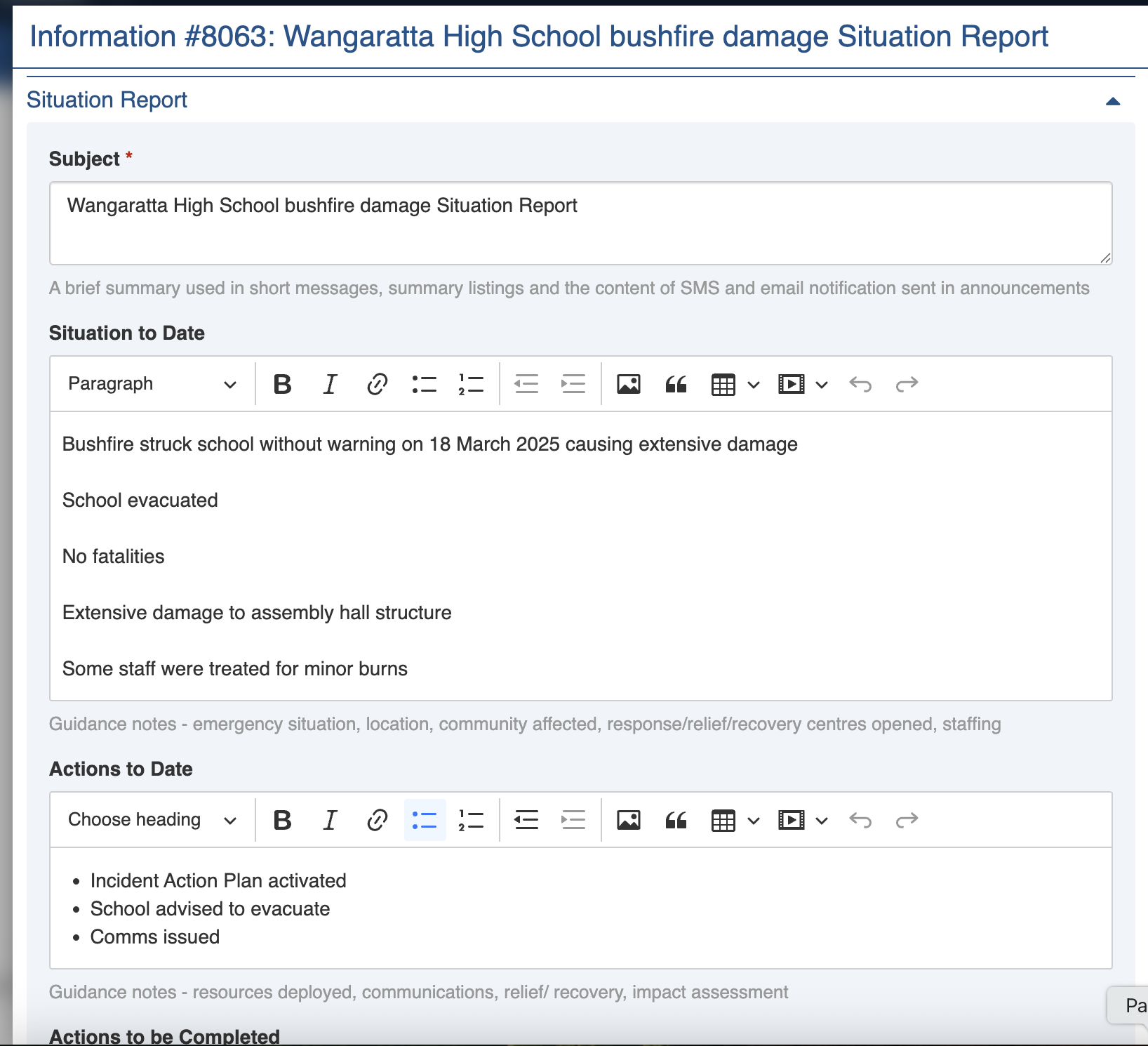 <figure><img src="https://3923904090-files.gitbook.io/~/files/v0/b/gitbook-x-prod.appspot.com/o/spaces%2FNy7IznbrPLUq6GJDDQDk%2Fuploads%2FRQCTsRIwjI9en0UkNebw%2Fimage.png?alt=media&#x26;token=2df957e2-bc4b-46d5-a7cb-24f580e7ef1c" alt="" width="563"><figcaption><p>Example Situation Report for school bushfire damage</p></figcaption></figure>