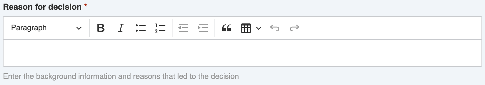 Use this to describe the reason in [rich text format](https://docs.cw.crisisworks.com/concepts-and-fundamentals/on-a-computer/using-the-datagrid/editing-items#rich-text-fields). This may include a detailed explanation of any background information or circumstances that led to the decision.&#x20;