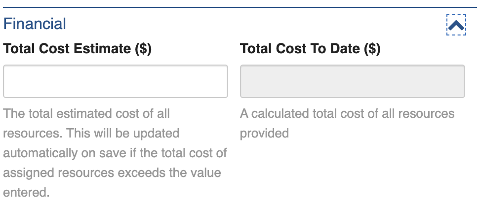 The Total Cost Estimate can be entered manually, however if the total cost of assigned resources exceeds the estimate entered the total of those assigned resources will be automatically displayed.