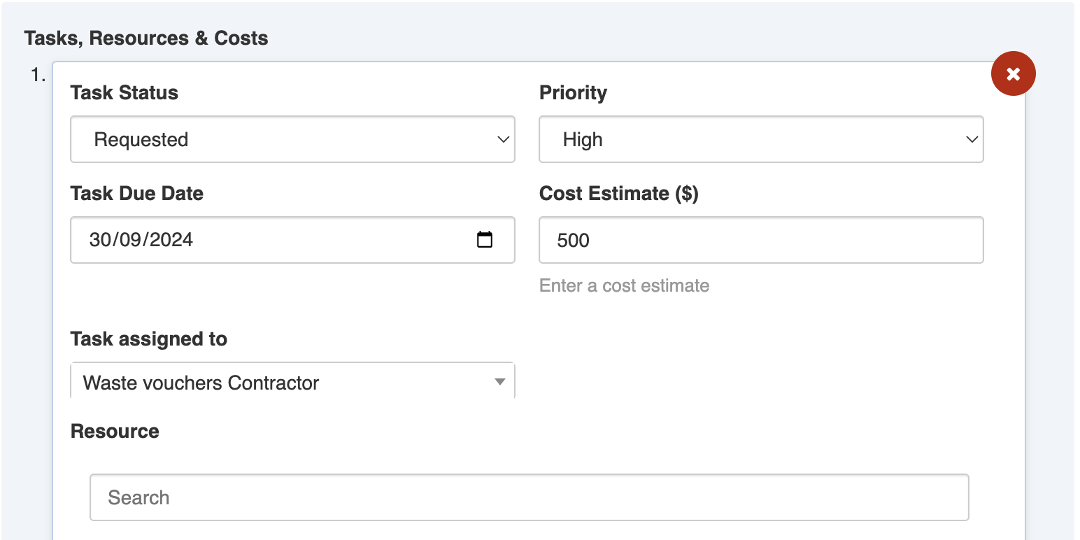 4. In the Tasks, Resources & Costs form, set the **Task Status** (all new tasks begin as 'Requested'), **Priority**, **Task Due Date** and **Cost Estimate**\ <img src="https://3923904090-files.gitbook.io/~/files/v0/b/gitbook-x-prod.appspot.com/o/spaces%2FNy7IznbrPLUq6GJDDQDk%2Fuploads%2FzoubSCzPUUFLKYCXedV5%2Fimage.png?alt=media&#x26;token=79d803d5-981c-49f4-b295-87170b450a64" alt="" data-size="original">
