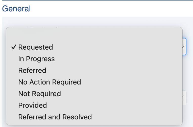 Setting the status to **Provided** or one of the grey options above such as **Not Required**, **Referred and Resolved** or **No Action Required** will resolve it and remove it from the Active view.