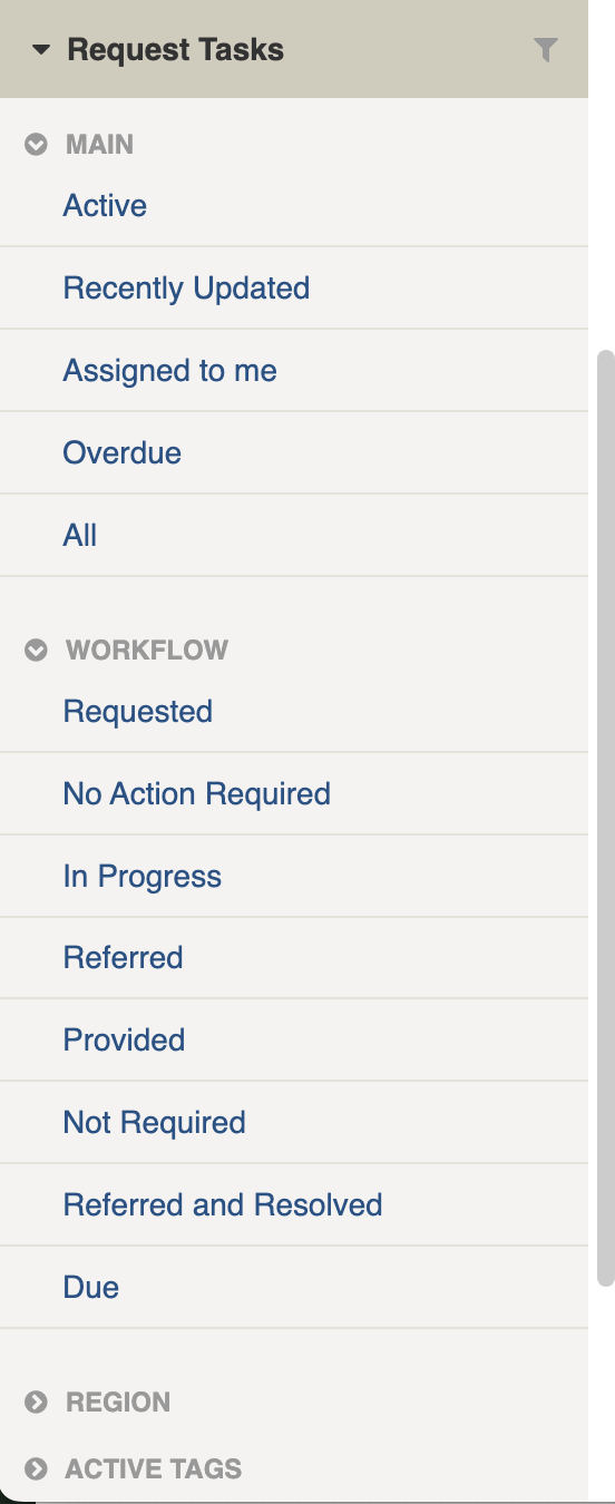 <table><thead><tr><th width="247">Filter Group</th><th>Filter/s</th><th>Use</th></tr></thead><tbody><tr><td>Main</td><td>Active, Recently Updated, Assigned to me, Overdue, All</td><td></td></tr><tr><td>Workflow</td><td>Requested</td><td>Finds all items with Status of Requested</td></tr><tr><td></td><td>No Action Required</td><td>Finds all items with Status of No Action Required</td></tr><tr><td></td><td>In Progress</td><td>Finds all items with Status of In Progress</td></tr><tr><td></td><td>Referred</td><td>Finds all items with Status of In Referred</td></tr><tr><td></td><td>Provided</td><td>Finds all items with Status of In Provided</td></tr><tr><td></td><td>Not Required</td><td>Finds all items with Status of In Not Required</td></tr><tr><td></td><td>Referred and Resolved</td><td>Finds all items with Status of Referred and Resolved</td></tr><tr><td>Region</td><td>[List is based on your system configuration]*</td><td></td></tr><tr><td>Active tags</td><td>[List is based on your system configuration]*</td><td><p>Any tags in use.</p><p>Refer to: <a href="../../../concepts-and-fundamentals/on-a-computer/using-the-datagrid/tagging-items">tags</a></p></td></tr></tbody></table>