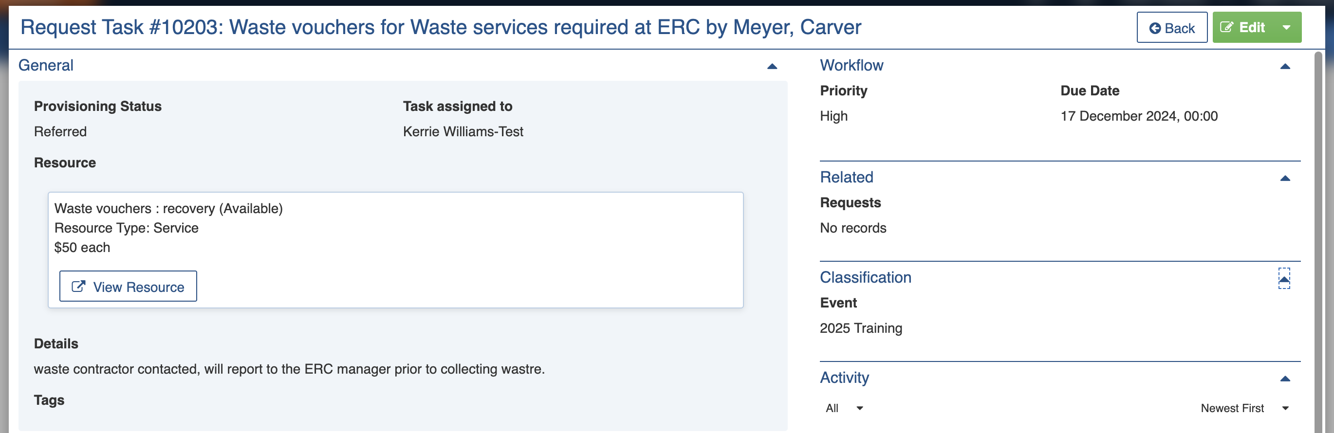 Newly created Requests will have a Provisioning status of **Requested** and may be progressed by changing this setting it to **In Progress** or **Referred**. When the Request Task has been completed, the Provision status should be updated to indicate the job is complete.