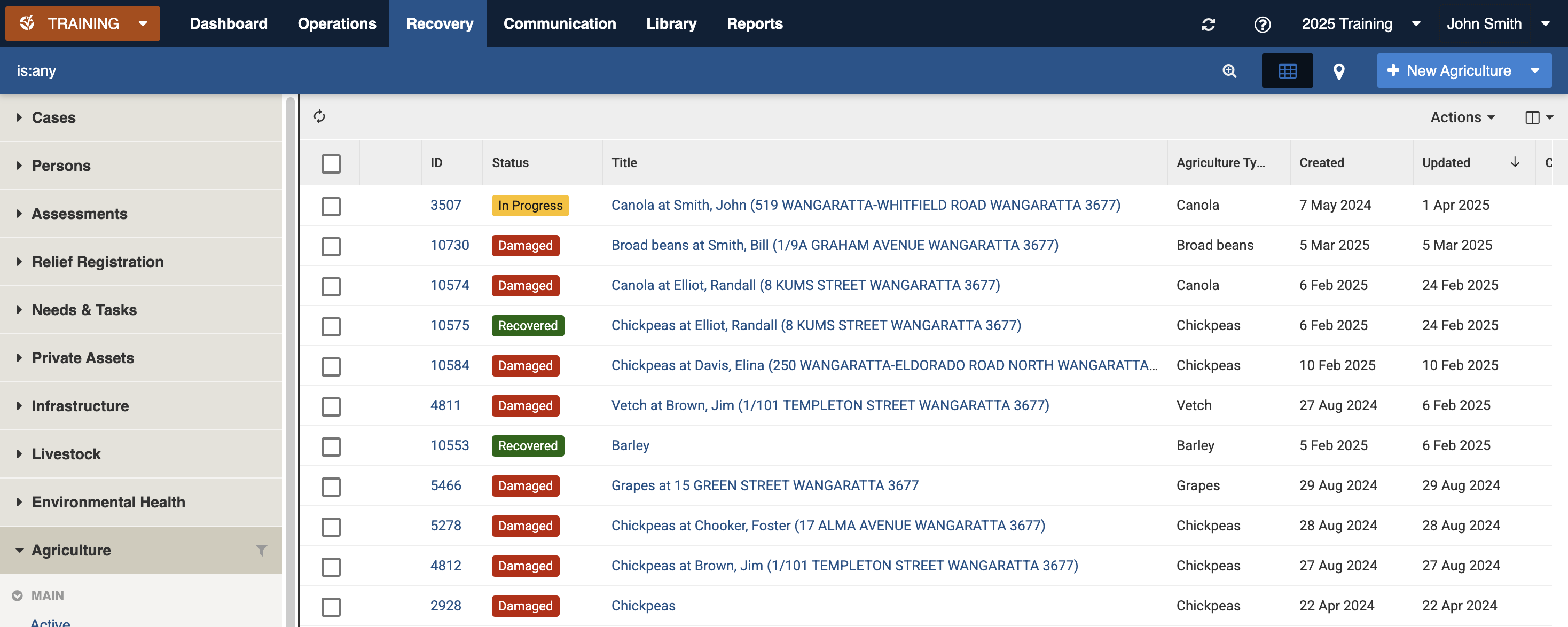 The Agriculture register records impacts to crops. Agriculture is a sub-item of [Cases](https://docs.cw.crisisworks.com/modules/recovery/cases) and as such items in the register are attached to or added in existing Case record(s). Once added you can manage existing Agriculture records directly in the register.