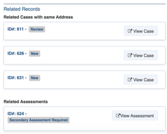 Related Records highlights Cases and Assessments with the same address. This helps avoid duplication.&#x20;