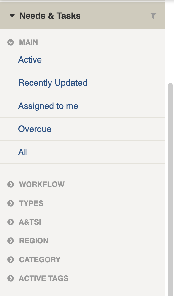 <table><thead><tr><th width="247">Filter Group</th><th>Filter/s</th><th>Use</th></tr></thead><tbody><tr><td>Main</td><td>Shows Active, Recently updated, Assigned to me, Overdue and All</td><td></td></tr><tr><td>Workflow</td><td>Requested</td><td></td></tr><tr><td></td><td>No Action Required</td><td></td></tr><tr><td></td><td>In Progress</td><td></td></tr><tr><td></td><td>Referred</td><td></td></tr><tr><td></td><td>Provided</td><td></td></tr><tr><td></td><td>Not Required</td><td></td></tr><tr><td></td><td>Referred and Resolved</td><td></td></tr><tr><td></td><td>Due</td><td></td></tr><tr><td>Types</td><td>Relief/Cases, Infrastructure Services</td><td></td></tr><tr><td>A&#x26;TSI</td><td>Cultural Specific Support</td><td>Finds all Needs/Tasks that require cultural support</td></tr><tr><td>Region</td><td></td><td></td></tr><tr><td>Category</td><td></td><td></td></tr><tr><td>Active tags</td><td></td><td><p>Any tags in use.</p><p>Refer to: tags</p></td></tr></tbody></table>