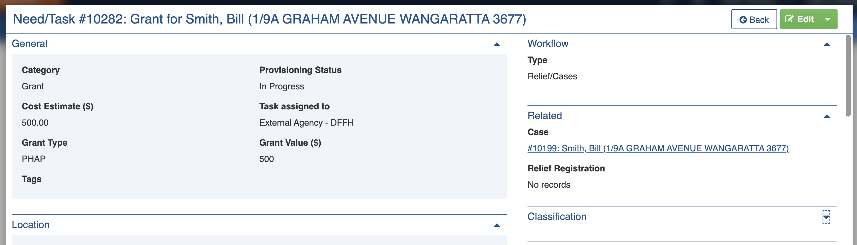 <figure><img src="https://3923904090-files.gitbook.io/~/files/v0/b/gitbook-x-prod.appspot.com/o/spaces%2FNy7IznbrPLUq6GJDDQDk%2Fuploads%2FKc5RYzY27qvcJaHkx2p3%2Fimage.png?alt=media&#x26;token=5b500a4d-62df-4cc7-a0fe-80f3da1a605e" alt=""><figcaption><p>Sample Need/Task for provision of a  grant associated with a Case assigned to external agency DFFH</p></figcaption></figure>