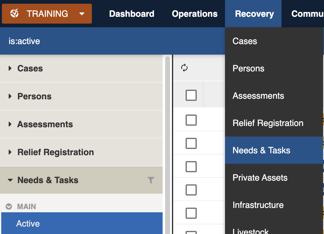 * Recovery Needs & Tasks (also available from the [Actions menu](#bulk-actions))