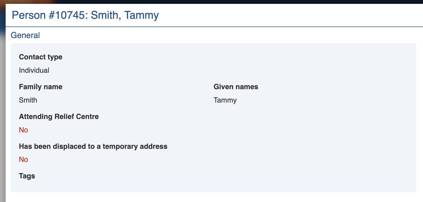 If the *Person* record was created via a Case or Relief Registration, a link will be listed here to those related parent records.