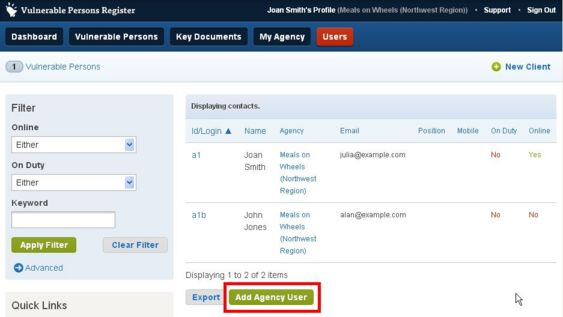 3\. On the Users tab, use the **Add Agency User** button<br>