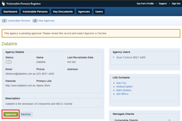 Before an Agency user can access the system, the Agency must be approved by a VPR Coordinator of the responsible LGA.