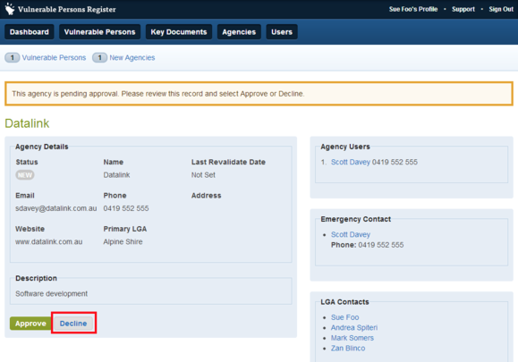 3. Use the **Decline** button.  Once declined, the Agency will be removed from the VPR.