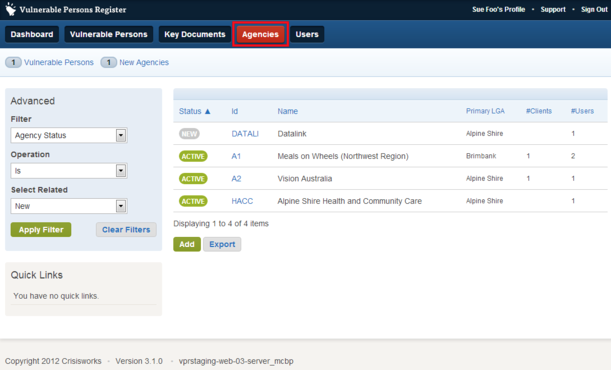 * Data Export - exports a CSV (Excel spreadsheet compatible) file containing the contact details for each agency matching the currently set filter