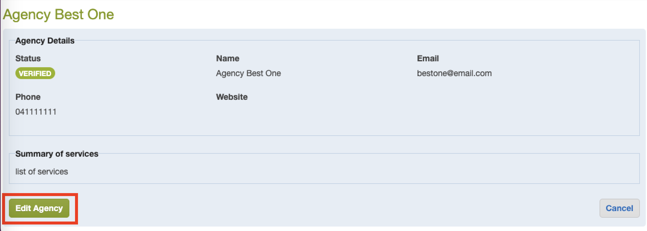 2. On the Agency profile page use the **Edit Agency** button at the bottom of the Agency profile screen
