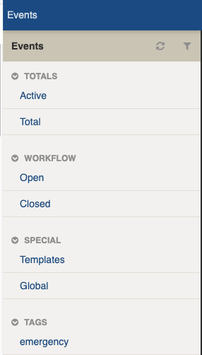 <table><thead><tr><th width="158.16015625">Filter Group</th><th>Filter/s</th><th>Use</th></tr></thead><tbody><tr><td>Totals</td><td></td><td></td></tr><tr><td></td><td>Active</td><td>Finds all Events with a Status of Open</td></tr><tr><td></td><td>Total</td><td>Finds all Events (either a Status of Open or Closed)</td></tr><tr><td>Workflow</td><td></td><td></td></tr><tr><td></td><td>Open</td><td>Finds all Events with a Status of Open</td></tr><tr><td></td><td>Closed</td><td>Finds all Events with a Status of Closed</td></tr><tr><td>Special</td><td></td><td></td></tr><tr><td></td><td>Templates</td><td>Finds all items with This is a template ticked</td></tr><tr><td></td><td>Global</td><td>Finds all items with This is a global event ticked</td></tr><tr><td>Tags</td><td>[List is based on your system configuration]*</td><td><p>Any tags in use.</p><p>Refer to: <a href="../concepts-and-fundamentals/on-a-computer/using-the-datagrid/tagging-items">tags</a></p></td></tr></tbody></table>