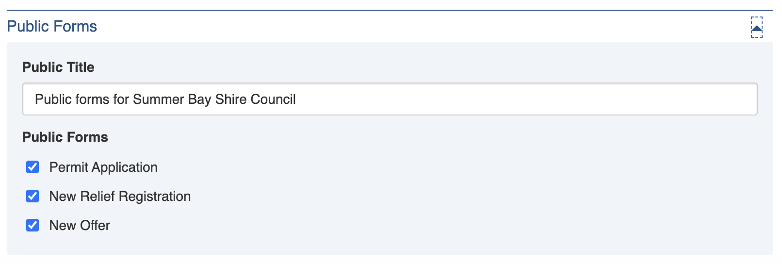 Public forms can be enabled to allow members of the public to enter information directly into your system. For example Permits, Relief Registrations and Offers. &#x20;