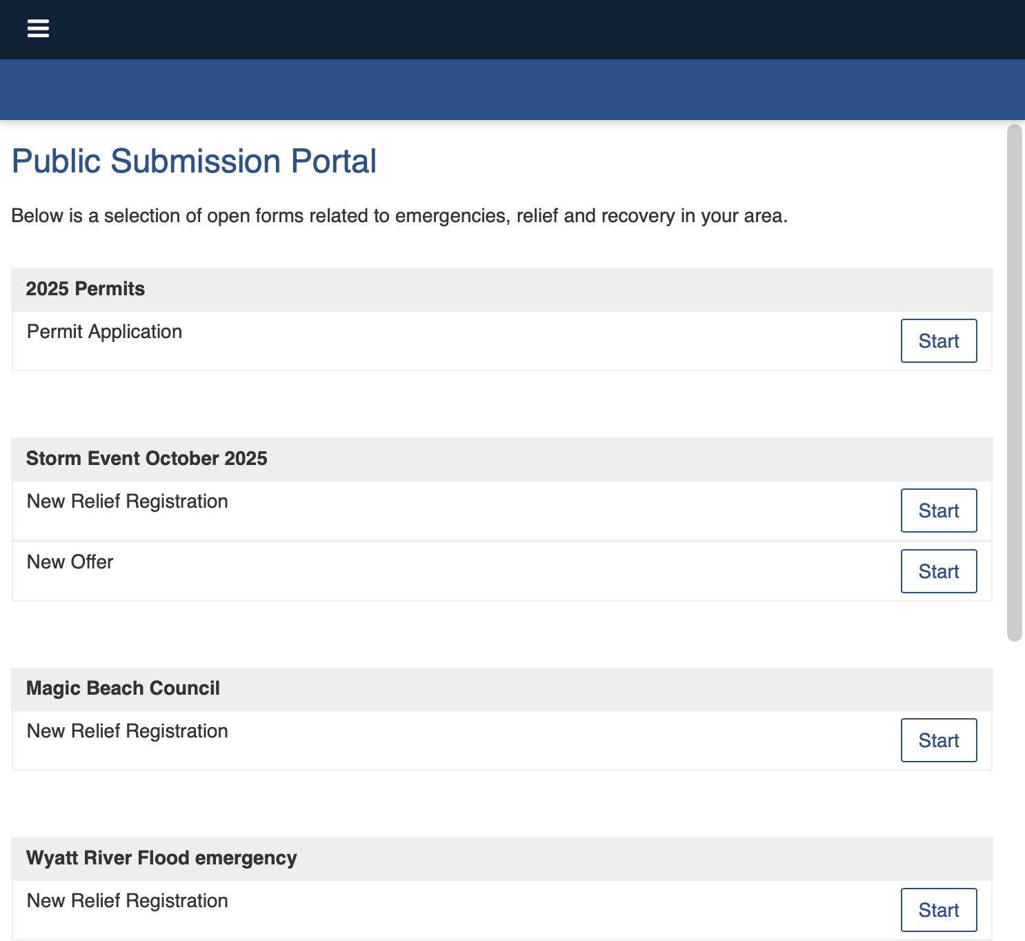 The Public Submissions Portal groups forms by Event. Users press the Start button to submit a form.&#x20;