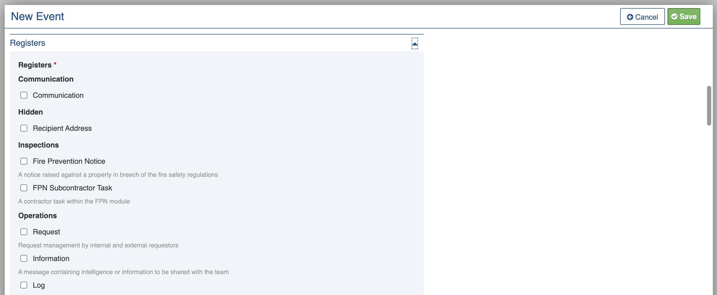 * Tick the Registers relevant to your event. You can modify this list later if needed.